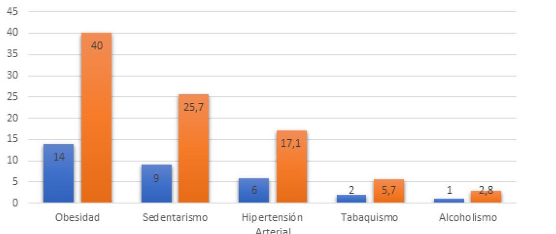Se encontró predominio de pacientes con obesidad (40 %) y sedentarismo (25,7 %) como principalesantecedentes patológicos personales (figura 1).