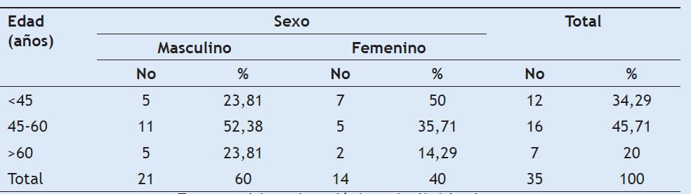 Se encontró predominio de pacientes del sexo masculino (60 %), y del grupo de edades entre 45 y 60 años(45,71 %) (tabla 1).