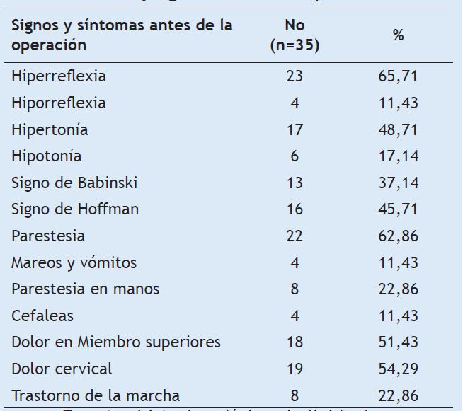 La hiperreflexia se identificó en el 65,71 %, seguido de la parestesia (62,86 %) y dolor cervical (54,29 %)como principales síntomas y signos clínicos previos a la operación (tabla 2)