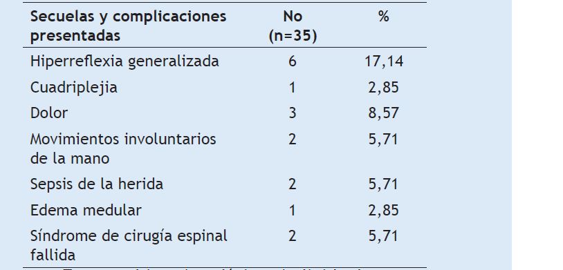El segmento cervical más afectado fue C5-C7 (91,42 %). Se encontró predominio de la hiperreflexia generalizadacomo secuela (17,14 %); y como complicación las sepsis de la herida(5,71 %) y el síndrome de cirugía espinalfallida(5,71 %) (tabla 3).