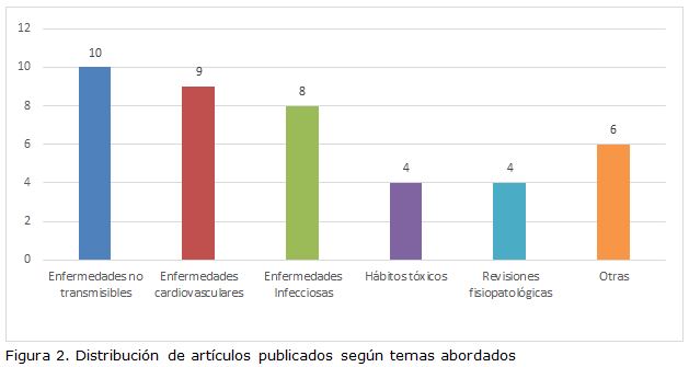 Predominaron los artículos sobre enfermedades no transmisibles (24,4 %), entre las cuales la hipertensión arterial ocupó el primer lugar (n=5); seguido de las enfermedades cardiovasculares (21,95 %) e infecciosas (19,51 %) (Figura 2).