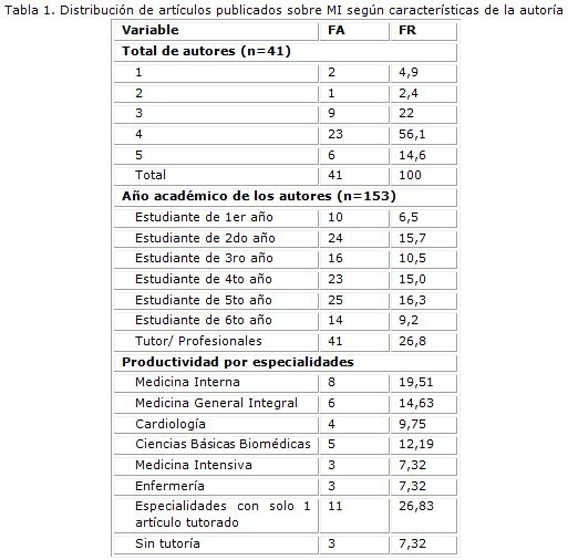 Relacionado con las características de la autoría en publicaciones sobre MI, predominaron los artículos con 4 autores (56,1 %), y con autoría de estudiantes de 5to año (16,34 %). Las especialidades de mayor contribución fueron Medicina Interna (19,51 %), seguida de Medicina General Integral (14,63 %). Se cuantificaron 11 especialidades con solo 1 artículo tutorado (tabla 1).