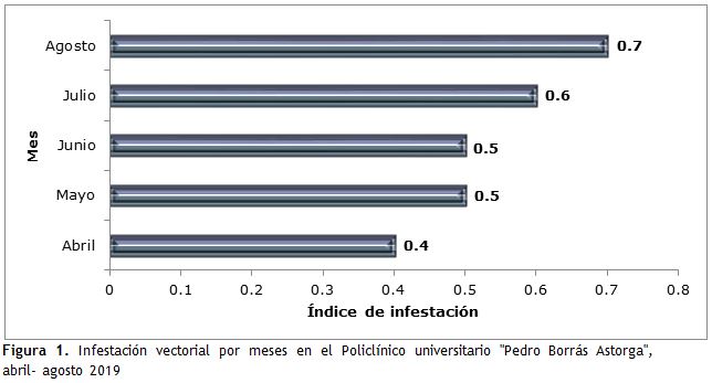 Respecto a la infestación vectorial por meses, se encontró un aumento del índice de infestación en los meses julio (0,6) y agosto (0,7) (figura 1).