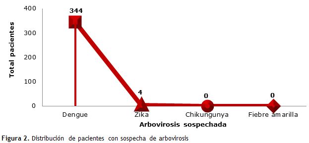 Se encontró que en el 98,9 % de los pacientes con sospecha de arbovirosis, se infirió presencia de dengue (figura 2).