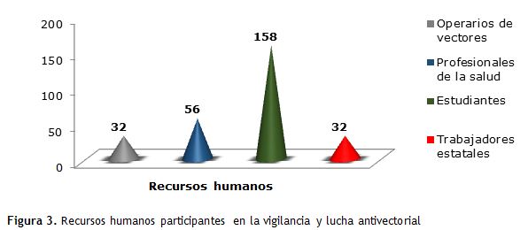 En cuanto a los recursos humanos participantes en la vigilancia y lucha antivectorial predominó la presencia de estudiantes (56,8 %) (figura 3).
