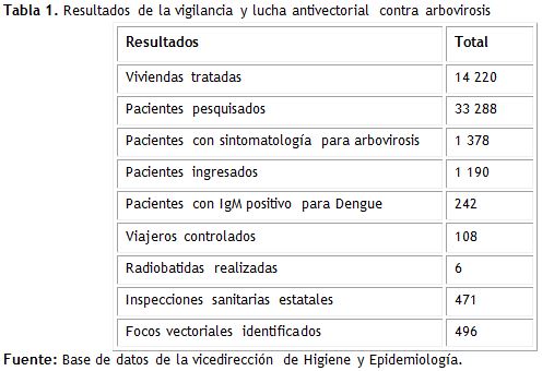 Resultados: el índice de infestación más alto se encontró en el mes de agosto (0,7), en el 98,9 % de los pacientes se sospechó presencia de dengue. Predominó la presencia de recursos humanos estudiantes (56,8 %) en la actividad de lucha antivectorial. Fueron tratados 33 288 pacientes y se identificó 1378 enfermos con sintomatología para arbovirosis. Predominó la técnica cara a cara (23 590) como actividad educativa sobre arbovirosis.
