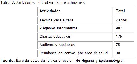 Relacionado con las actividades educativas sobre arbovirosis en el área de salud resultaron destacadas la técnica cara a cara (23 590), seguida por las actividades uso de plegables informativos (982) y charlas educativas (175) (tabla 2).