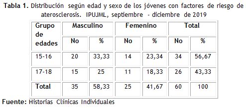 Results: male sex predominated (58,33 %), and ages between 14 and 16 years (56,67 %). Seventy percent (70 %) of patients presented family history of atherosclerotic disease, 68,3 % obesity and 58,3 % practiced sedentary lifestyle. Fifty percent (50 %) of patients presented only one risk factor; 5 % of them presented three or more risk factors.