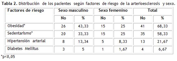 El 70 % de los pacientes presentó antecedentes familiares de enfermedad aterosclerótica. Con respecto a los factores de riesgo, el 68,3 % de los pacientes presentó obesidad, y el 58,3 % presentó un estilo de vida sedentario. Se encontró una asociación estadística significativa entre la obesidad y sedentarismo con el sexo (tabla 2).