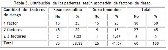 El 50 % de los pacientes presentaron un solo factor; solo el 5 % presentó tres factores o más (tabla 3).