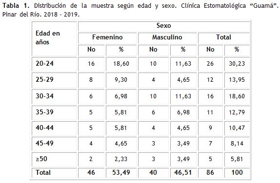 Teniendo en cuenta la distribución de los pacientes según edad y sexo de la muestra estudiada, predominó el sexo femenino con 53,5 % y el grupo de edades de 20 a 24 años (30,23 %) (tabla 1).