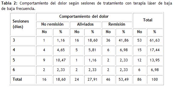 Se observó predominio de alivio y remisión a partir de la tercera sesión de tratamiento, (60,5 %).