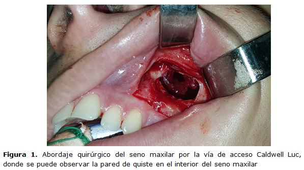 Presentación del caso: Paciente masculino, de color de piel blanca, de 15 años de edad, que comenzó a notar salida de secreciones a través de solución de continuidad en mucosa de reborde alveolar en región de la tuberosidad maxilar izquierda, además presentaba inflamación de esa hemicara y dolor, recibió tratamiento en nivel primario con penicilinas, cefalexina y metronidazol sin mejoría clínica por lo que se ingresa en el servicio de Cirugía Maxilofacial del Hospital Pediátrico Provincial Docente “Pepe Portilla”. Se indican estudios imagenológicos diagnosticándose quiste dentígero asociado a tercer molar retenido en el seno maxilar izquierdo. Se indica terapia antimicrobiana y se interviene quirúrgicamente realizándose abordaje intraoral y técnica de Caldwell Luc.