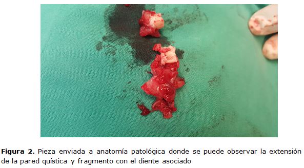 Se indica terapia antimicrobiana y se interviene quirúrgicamente realizándose abordaje sinusal por Caldwell Luc (figura 1). Se envía muestra (figura 2) al departamento de anatomía patológica donde el resultado histológico de la biopsia excisional determina un quiste dentígero infectado secundariamente