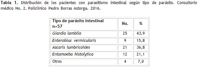 Introduction: diseases caused by intestinal parasites are a serious health problem in children.Objective: to characterize the intestinal parasitism in the population between one and ten years of the community attended by the medical clinic No. 2 of the Pedro Borras Astorga Polyclinic, during the year 2017.Method: an observational, descriptive and transversal study was carried out. The universe consisted of 123 children, selecting a sample of 57. A bibliographic review of materials and sources was made on the different aspects treated in the research and the documentary analysis of the individual clinical histories; In addition, a data collection form was prepared, based on the medical interview. All variables were given an absolute and relative percentage frequency distribution.Results: male sex prevailed (54,4 %) and the age group between six and ten years old (51,2 %). Giardia lamblia was the main intestinal parasite (43,9 %). Abdominal pain was the main clinical manifestation (49,1 %). 70,2 % of the patients were normal weight. 38,6 % washed their hands before eating and 43,9 % after defecating. 42,1 % washed the food before ingesting it. 71,9 % drink treated water. The treatment of choice was effective in 61,4 % of the patients.Conclusions: the actions of prevention of health by the basic work team contribute to diminish the incidence of intestinal parasitism in the infantile population.