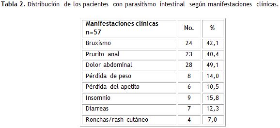 El dolor abdominal fue la principal manifestación clínica con un 49,1 %; seguido por el bruxismo y el purito anal con un 42,1 % y 40,4 % respectivamente.