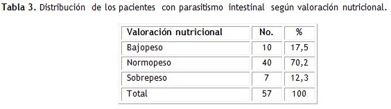 Resultados: predominó el sexo masculino (54,4 %) y el grupo de edad entre seis y diez años (51,2 %). La giardia lamblia constituyó el principal parásito intestinal (43,9 %). El dolor abdominal fue la principal manifestación clínica (49,1 %). El 70,2 % de los pacientes eran normopeso. El 38,6 % se lavaban las manos antes de ingerir alimentos y el 43,9 % después de defecar. El 42,1 % lavaban los alimentos antes de ingerirlos. El 71,9 % beben agua tratada. En el 61,4 % de los pacientes fue efectivo el tratamiento de elección.