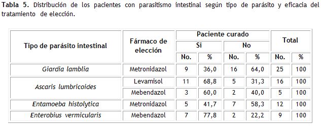 En el 61,4 % de los pacientes fue efectivo el tratamiento de elección. El 64,0 % de los pacientes con giardia lamblia, no se curaron utilizando el metronidazol, al igual que el 58,3 % de los niños con entamoeba histolytica. El 77,8 % de los pacientes con enterobius vermicularis se curaron utilizando mebendazol. El levamisol curó al 68,8 % de los niños con ascaris lumbricoides (tabla 5).