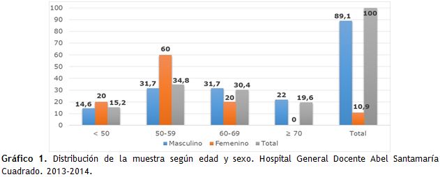 Se constató en la muestra analizada, predominio del sexo masculino (89,1 %), así como del grupo etáreo 50-59 años (34,8 %) (gráfico 1).