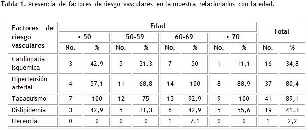 Objective: to characterize the behavior of the abdominal aortic aneurysm. Method: a descriptive, prospective, observational study was conducted in patients with abdominal aortic aneurysm treated at Abel Santamaria Cuadrado General Teaching Hospital, between 2013 and 2014. A sample of 46 patients was intentionally chosen from the target group of 67 patients, satisfying the inclusion and exclusion criteria. The analysis of the clinical records allowed collecting the information in order to analyze the variables. Medical ethical principles were met.