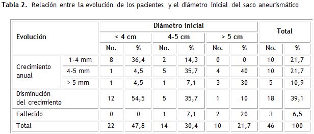 Resultados: predominaron los hombres (89,1 %), el grupo etáreo 50-59 años (34,8 %), y los individuos con una aneurisma de diámetro inicial menor de cuatro centímetros (47,8 %), constatándose como el 39,1 % presentó durante la reevaluación un enlentecimiento del crecimiento. El tabaquismo y la hipertensión arterial fueron los principales factores de riesgo vascular; comprobándose un mayor enlentecimiento del crecimiento al controlar el tabaquismo (80,8 %) que la hipertensión arterial (56,8 %). Sólo el 13,0 % requirió intervención quirúrgica, siendo casi exclusiva en aquellos con un diámetro inicial mayor de cinco centímetros (50 %).