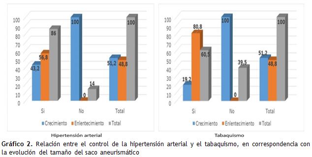 Al relacionar el crecimiento del saco aneurismático con el control de la hipertensión arterial y el tabaquismo, se comprobó mayor enlentecimiento del mismo en relación al control del tabaquismo (80,8 %) que ante la hipertensión arterial (56,8 %) (gráfico 2).