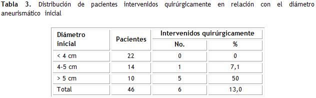 Dentro de los pacientes atendidos, sólo el 13,0 % requirió intervención quirúrgica, siendo casi exclusiva esta intervención de aquellos con un diámetro inicial mayor de cinco centímetros (50 %) (tabla 3).