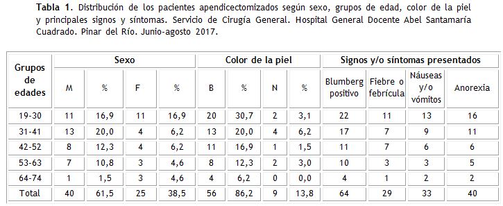 El grupo de edades de mayor incidencia fuede 19 a 30 años, con un 33,8 %, el sexo masculino fue el más afectado con un 61,5 %. Predominóen los pacientes el color de piel blanca, representando el 86,2 %. En la sintomatología se registró el Signo de Blumberg positivo en el 98,5 % (tabla 1).