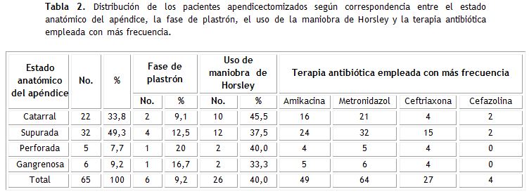 El 49,3 % de los pacientes presentó apendicitis supuradas, de las cuales el 12,5 % se encontraba en fase de plastrón. El segundo estado más común fue el catarral con un 33,8 %. En el 40 % de los pacientes se empleó la Maniobra de Horsley, siendo preferida en el 45,5% de las apendicitis en estado catarral y el 37,5 % de las supuradas. En el posoperatorio predominó la combinación de metronidazol con cefalosporinas y/o aminoglucósidos en los casos más complejos, o la monoterapia con cefalosporinas en los más leves y sin complicaciones. El metronidazol fue el más usado con un 98,5 %, combinado principalmente con amikacina (75,4 %) (tabla 2).