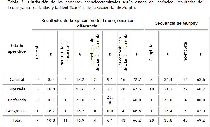 Solo 10,8 % no presentó alteraciones en el leucograma. La variación más frecuente fue la leucocitosis con desviación izquierda, presente el 66,2 % de los pacientes, seguida de neutrofilia sin leucocitosis en el 16,9 %. Se evidenció mayor aparición de Secuencia de Murphy completa en el estado catarral de la enfermedad (36,4 %), mientras que los estados avanzados de perforación y gangrena solo fueron completas en el 20 % y el 16,4 % respectivamente. La Secuencia de Murphy fue incompleta en el 69,2 %, independientemente del estado anatómico del apéndice (tabla 3).