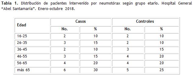 Method: an observational, analytical study of cases and controls was carried out in patients undergoing emergency surgery for pneumothorax at Abel Santamaria Cuadrado general teaching hospital, from January to October 2018. The patients were randomized 1:1 (20 cases / 20 controls).