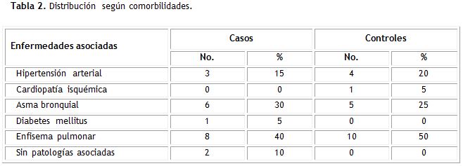 En cuanto a las enfermedades asociadas, en el 90% de los pacientes del grupo casos y en el 100% del grupo control se encontró patologías asociadas, existiendo un predominio del enfisema pulmonar con un 40 % en el grupo casos y 50 % los controles (tabla 2). Al analizar el estado físico se encontró un predominio de los pacientes ASA II.