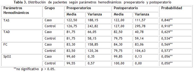 Velazco Morera(17) concluyó que no existieron diferencias significativas en la respuesta hemodinámica (p> 0,05), aunque la frecuencia cardiaca alcanzó valores medios ligeramente superiores en el posoperatorio con Bupivacaína sola. Otros autores reportan resultados similares(18,19), coincidiendo con la presente investigación.
