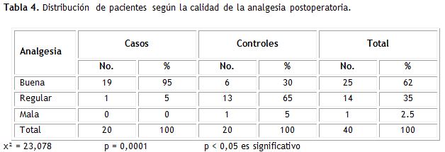 Se encontró que la calidad de la analgesia evaluada según la escala análogo-visual numérica en las 24 horas siguientes al proceder quirúrgico fue buena en el 95% de los pacientes del grupo casos, y buena en el 30% de los controles. En un paciente del grupo control fue mala.