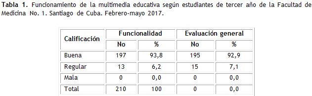 La totalidad de los encuestados manifestaron que los contenidos de la multimedia educativa se corresponden con la temática de la investigación. El 93,8 % de los encuestados encontraron una buena funcionalidad de la multimedia, y el 92,9 % al calificarla de forma general la calificó como buena (tabla 1).