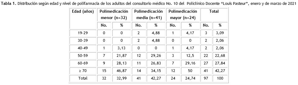 Results: predominance of patients from 70 years old or older (42,27 %) and average poly-medication (42,27 %). Self-medication was found in 77,4 % of patients. A total of 58,49 % of the population attended two or more inter-consultations and 33,01 % presented adverse drug reactions. Hypertension (77,32 %) and diabetes (27,84 %) predominated as comorbidities. Adherence was higher in ocular diseases and lower in oncologic diseases (100 %). An association was identified between major polypharmacy and unemployment (OR:3,37; CI:1,05-10,74; p=0,033), two or more comorbidities (OR:1,52; CI:1,28-1,8; p<0,01), adverse reactions (OR:5,17; CI:1,96-13,6; p<0,01), and two or more inter-consultations (OR:25,36; CI:3,27-196,68; p<0,01).