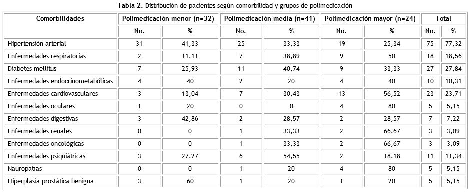Se reportó que el 77,32 % de los pacientes presentaron hipertensión arterial donde el análisis según grupos de polimedicación mostró fue menor en el 41,33 % de los hipertensos, por otra parte, las enfermedades que mostraron elevados porcentajes de polimedicación mayor fueron las enfermedades oculares (80 %), neuropatías (80 %), las enfermedades renales (66,67 %) y las oncológicas (66,67 %) (tabla 2).