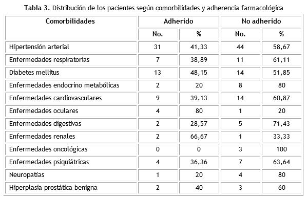 Con respecto a la adherencia farmacológica se mostraron mayores niveles de adherencias en las enfermedades oculares (80 %) y enfermedades renales (66,67 %) y mayores niveles de no adherencia en las enfermedades oncológicas (100 %), neuropatías (80 %), y enfermedades endocrino metabólicas (80 %) (tabla 3).