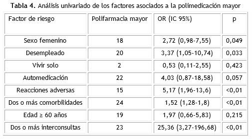 El análisis univariado identificó asociación de la polifarmacia mayor con el desempleo (OR:3,37; IC:1,05-10,74; p=0,033), dos o más comorbilidades (OR:1,52; IC:1,28-1,8; p<0,01), reacciones adversas (OR:5,17; IC:1,96-13,6; p<0,01), y dos o más interconsultas (OR:25,36; IC:3,27-196,68; p<0,01) (tabla 4).