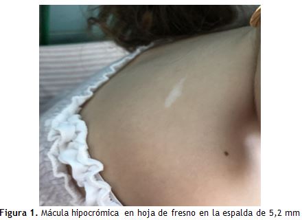 Al examen físico se encontró en la piel cuatro lesiones tipo máculas hipocrómicas múltiples de borde romo y agudo en forma de hoja de fresno, distribuidas en la espalda, con un tamaño de 5,2 mm (figura 1) y extremidades, con tamaños variados.
