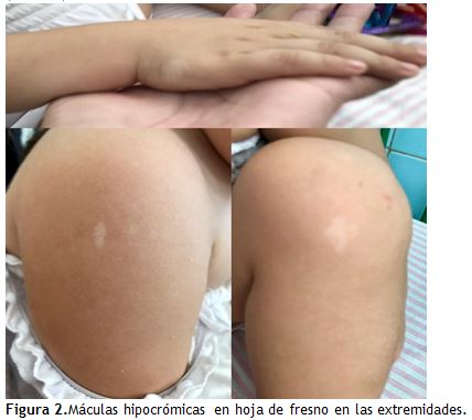 En cuanto a las lesiones dermatológicas, las más comunes reportadas en la literatura son las máculas hipopigmentadas, que se encuentran en el 90 % de los afectados; aparecen en forma de hoja de fresno en tronco y extremidades, además de otras no tan frecuentes como el parche de Shagreen, angiofibromas faciales y fibromas ungueales.(12) En este caso, las lesiones que se presentaron fueron las hipomelanómicas en forma de hoja de fresno en espalda y extremidades.