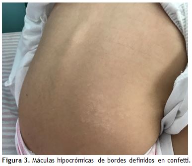 La paciente cumple con un criterio mayor (máculas hipomelanóticas, más de tres ≥ 5mm) y uno menor (lesiones cutáneas en confeti). Actualmente se encuentra en control periódico por los servicios de neuropediatría, cardiología, dermatología y oftalmología.