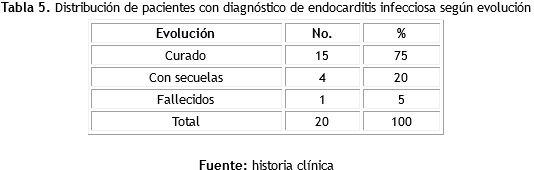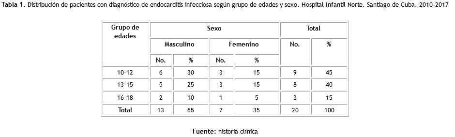 Method: an observational, descriptive and cross-sectional study was carried out. The target group comprised 20 adolescents with the diagnosis of infectious endocarditis treated at Norte Pediatric Hospital of Santiago de Cuba during the period 2010 to 2017. The information was collected from the medical records.