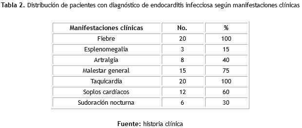 La endocarditis infecciosa se caracteriza por presentar abundantes manifestaciones clínicas, la fiebre constituye un elemento clínico de elevada frecuencia en los pacientes afectados por esta enfermedad, incluso siendo principal motivo de consulta en muchos de estos pacientes. En la investigación la totalidad de los adolescentes presentaron fiebre, esto coincide con los resultados obtenidos por varios autores(12,13). Los resultados encontrados difieren con los obtenidos por Braun(14), en el cual los soplos cardíacos constituyeron la manifestación clínica predominante.