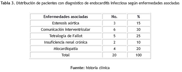 Entre las enfermedades asociadas presentes en los pacientes predominó la comunicación interventricular con un 30 %, seguida por la tetralogía de Fallot en un 25 % (tabla 3).