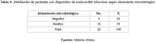 La endocarditis infecciosa puede presentar una elevada mortalidad si no es tratada adecuadamente; los resultados de esta investigación coinciden con Zalaquett y colaboradores(19), que en su estudio obtuvieron baja mortalidad.