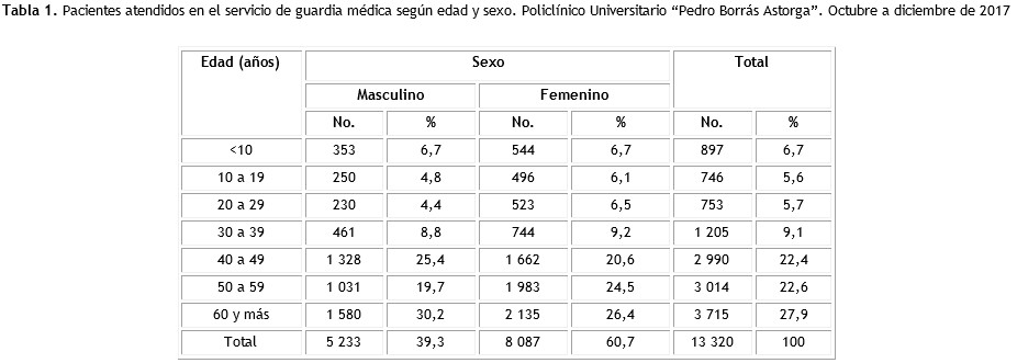 Relacionado con los pacientes atendidos en el servicio de guardia médica predominaron las edades de 60 y más años (27,9 %), así como el sexo femenino (60,7 %) (tabla 1).