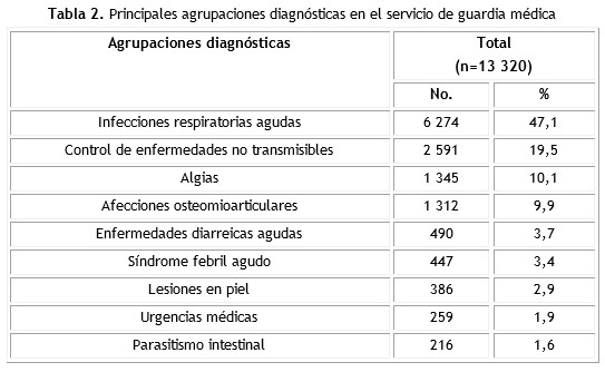 Atendiendo a los diagnósticos a pacientes realizados en la guardia médica se agruparon prevalentemente las infecciones respiratorias agudas (IRA) con 47,1 %, seguido del control de las enfermedades no transmisibles (19,5 %) (tabla 2).
