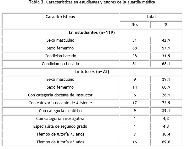 De acuerdo a las características del equipo de guardia médica, en los estudiantes predominó el sexo femenino (42,9 %), la condición no becado (68,1 %). En cuanto a los tutores predominaron las féminas (60,9 %), la categoría docente Asistente (73,9 %) y el tiempo de tutoría ≥5 años (69,6 %) (tabla 3).