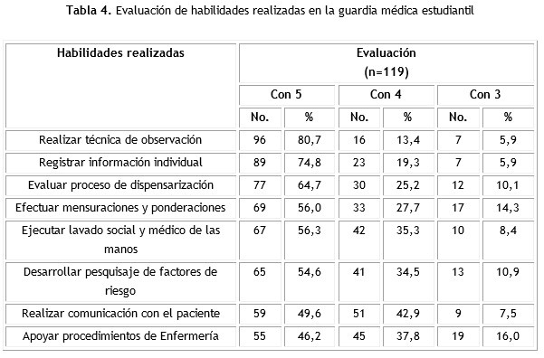 Atendiendo a la evaluación de las habilidades realizadas en la guardia médica, la mayoría de los estudiantes obtuvieron calificación de 5, fundamentalmente en realizar la técnica de observación con 96 educandos (80,7 %), seguido por registrar información individual con 89 (74,8 %) (tabla 4).